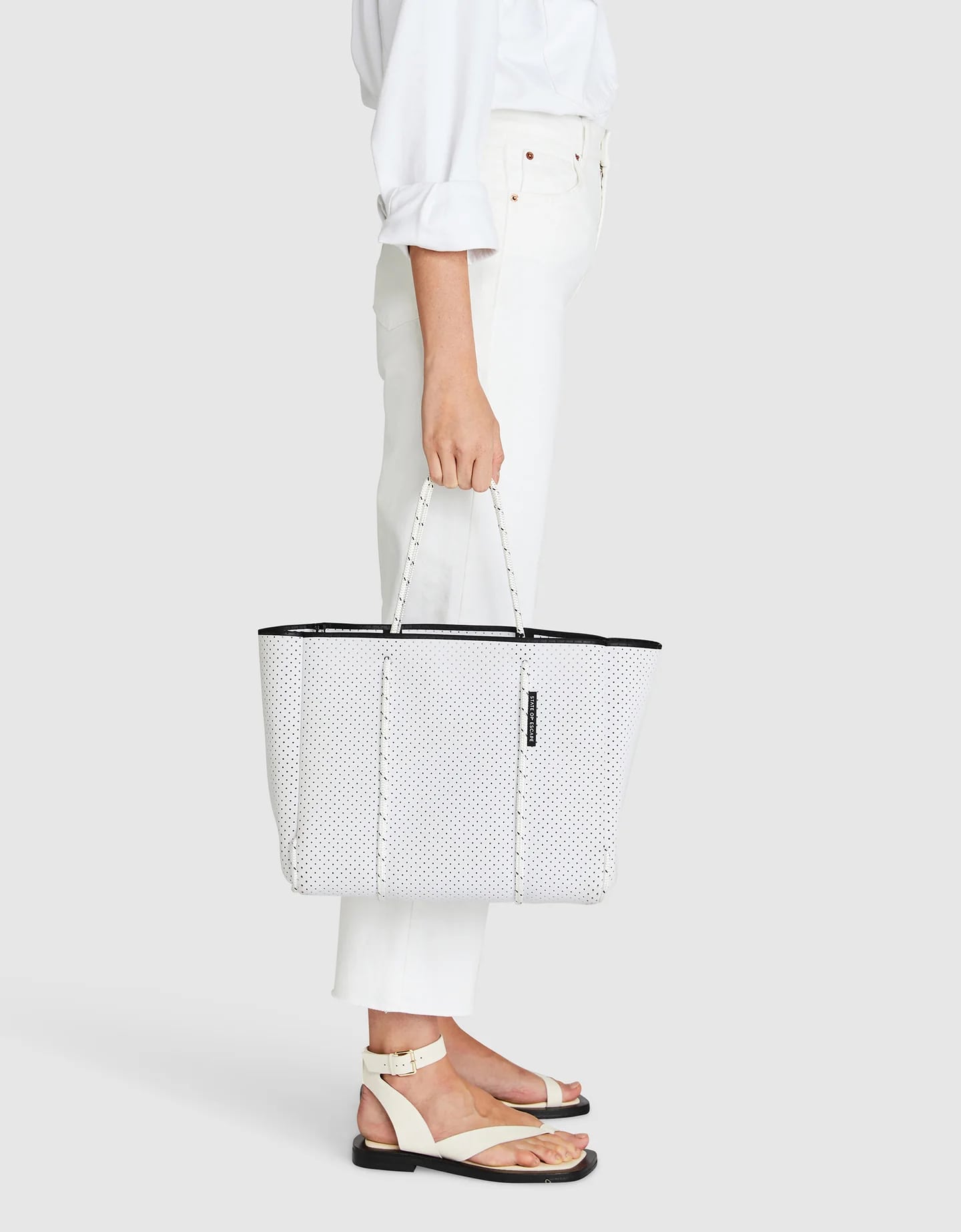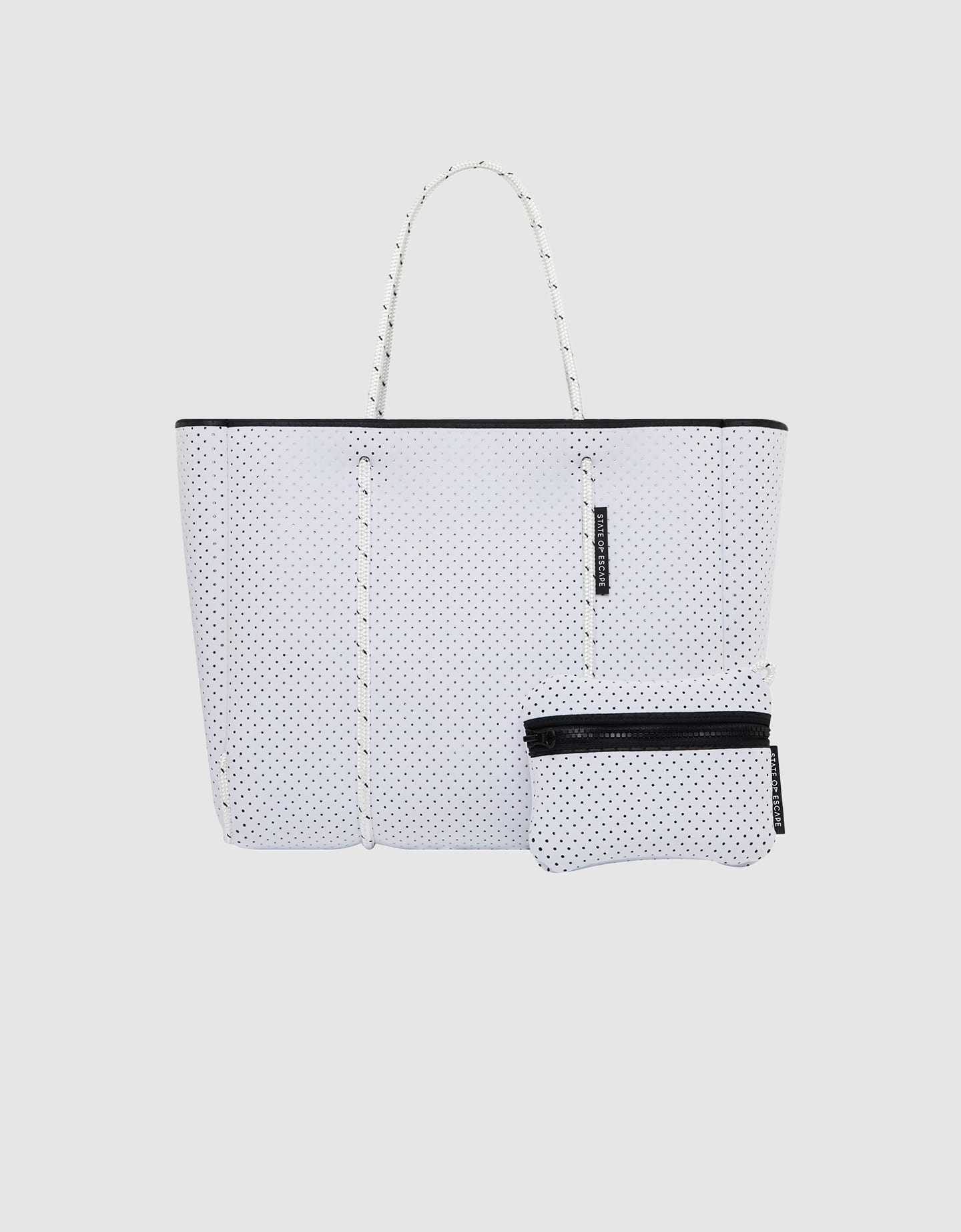バッグ底部のカラビナに装着できる同素材のポーチが付いており、小物の収納に最適。肩にかけるだけでなく、ハンドバッグとしてもエレガントに、オンオフ問わず幅広いシーンで活躍するバッグです。