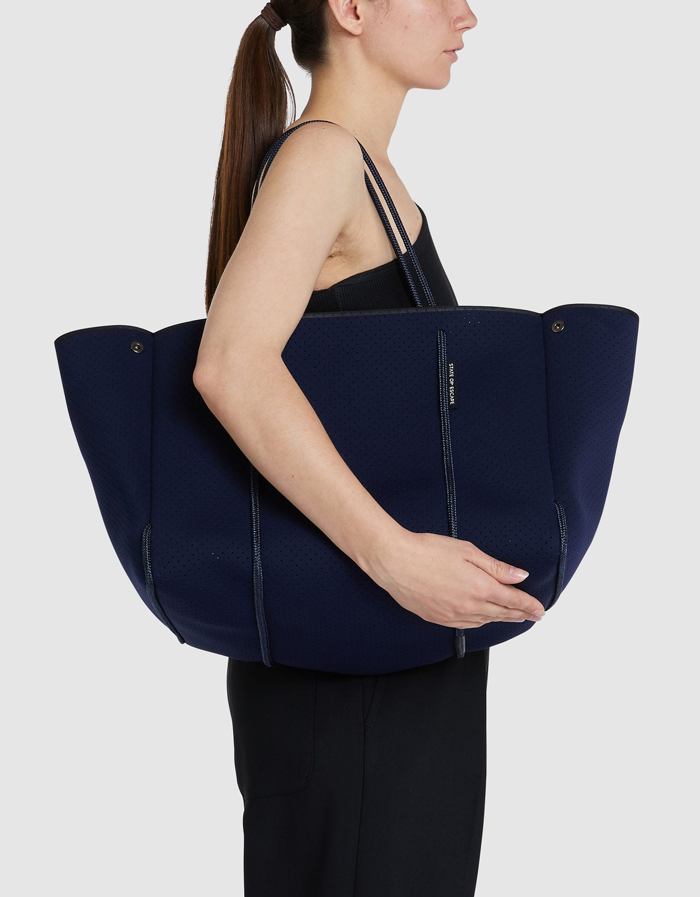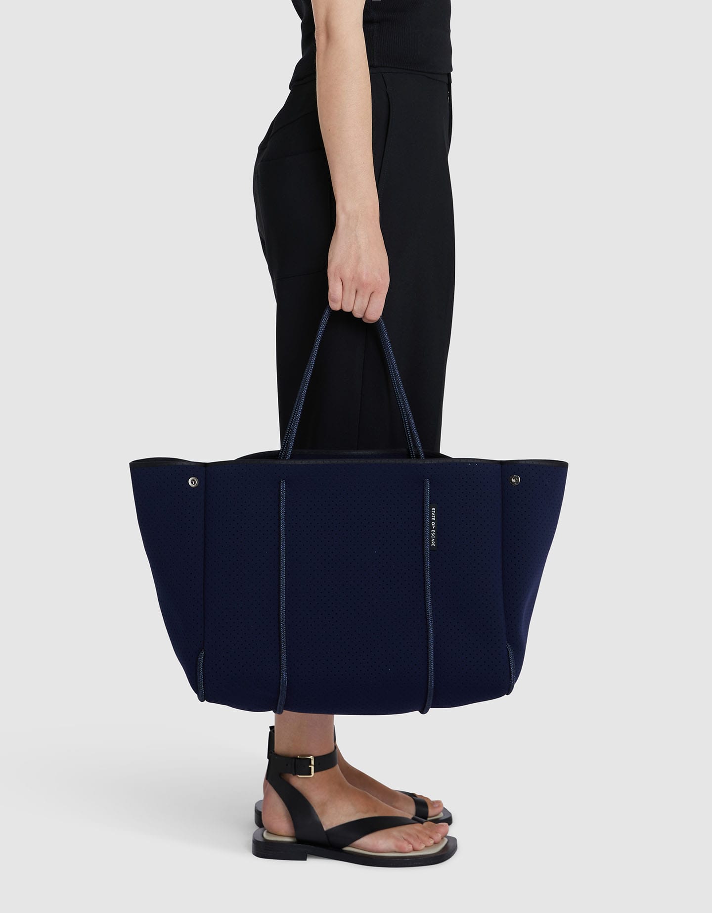 パンチングされたネオプレン生地に、ボディを引き立てる美しいセーリング用のロープを使用することで、シンプルながらもディティールにこだわったルックスを実現。