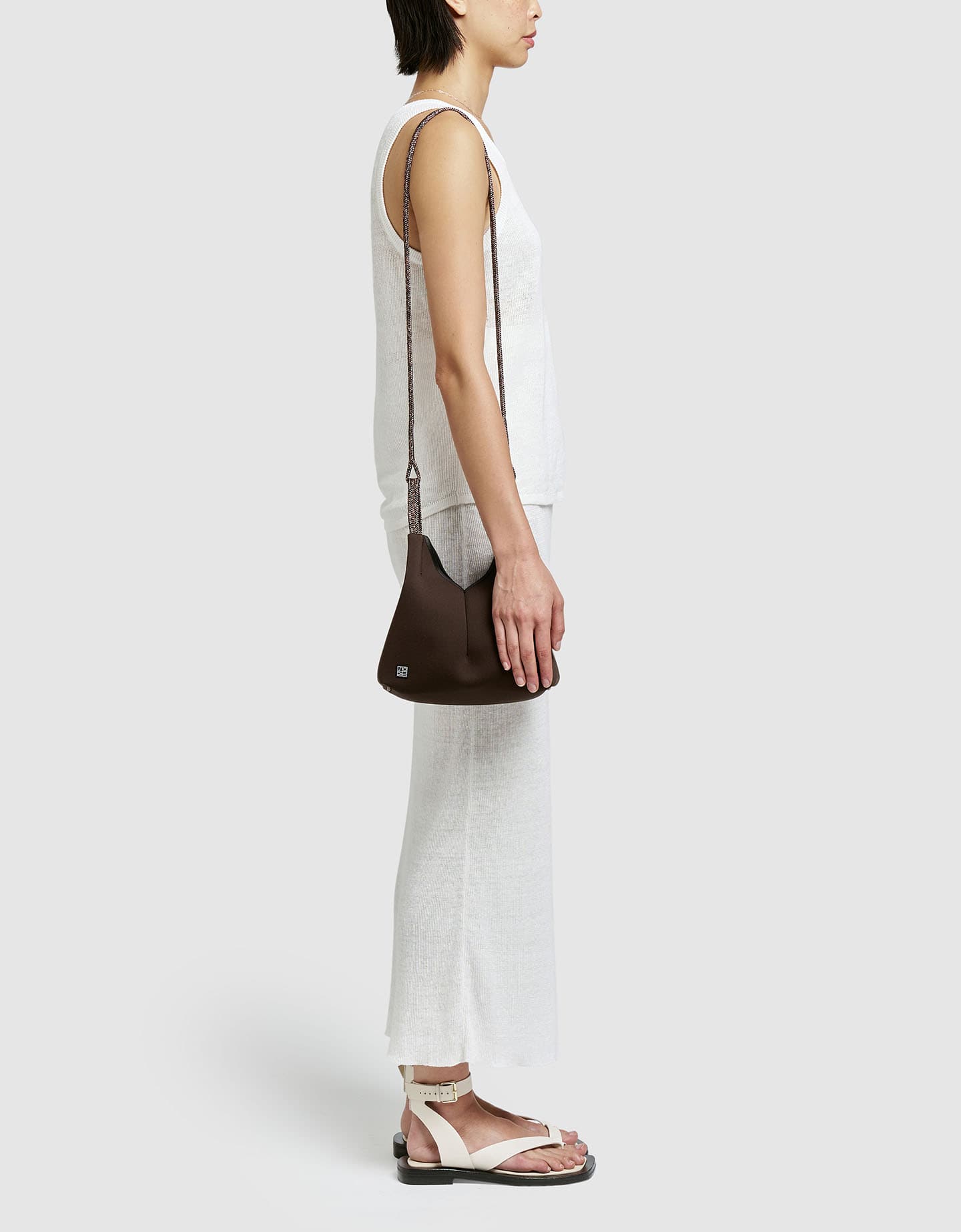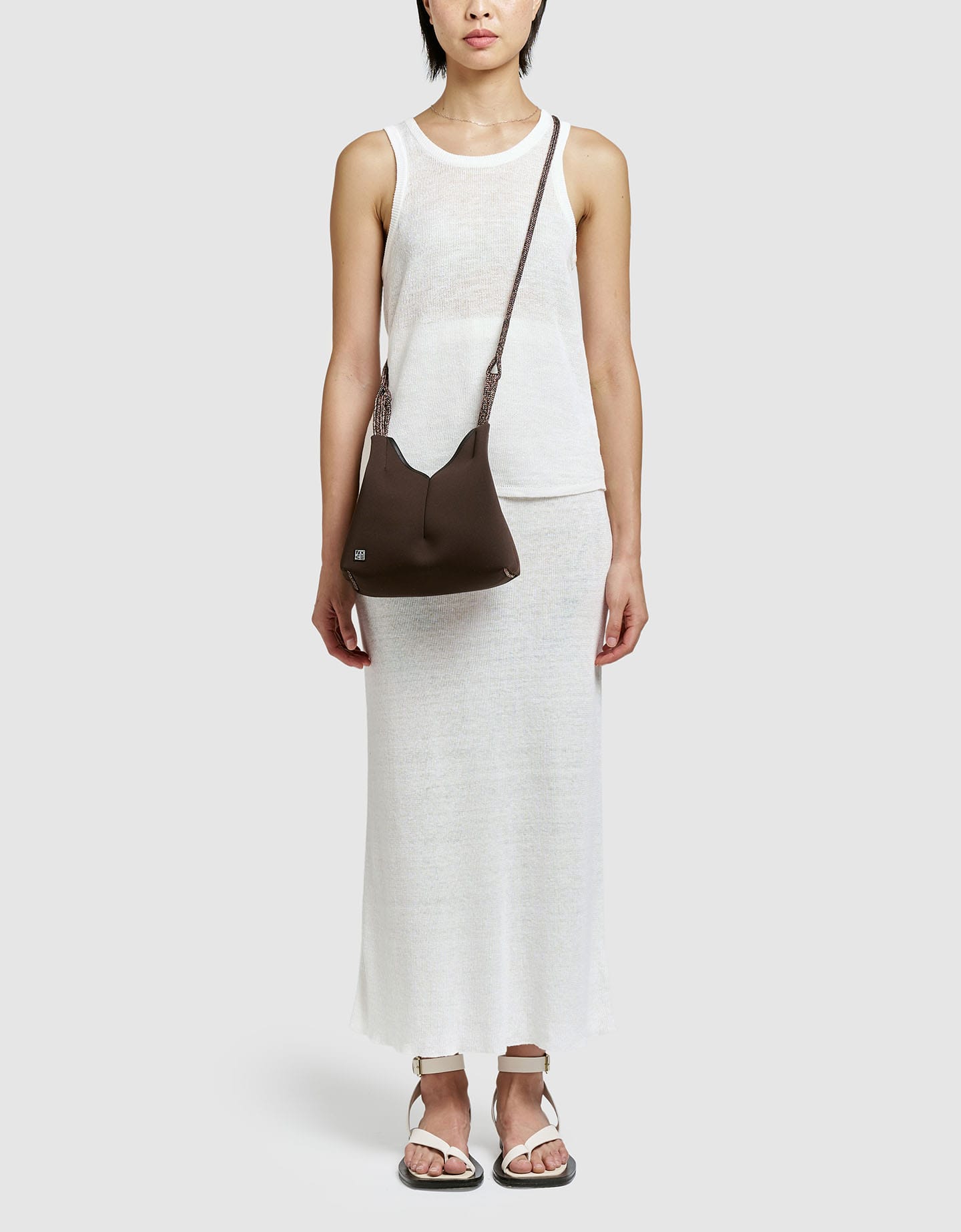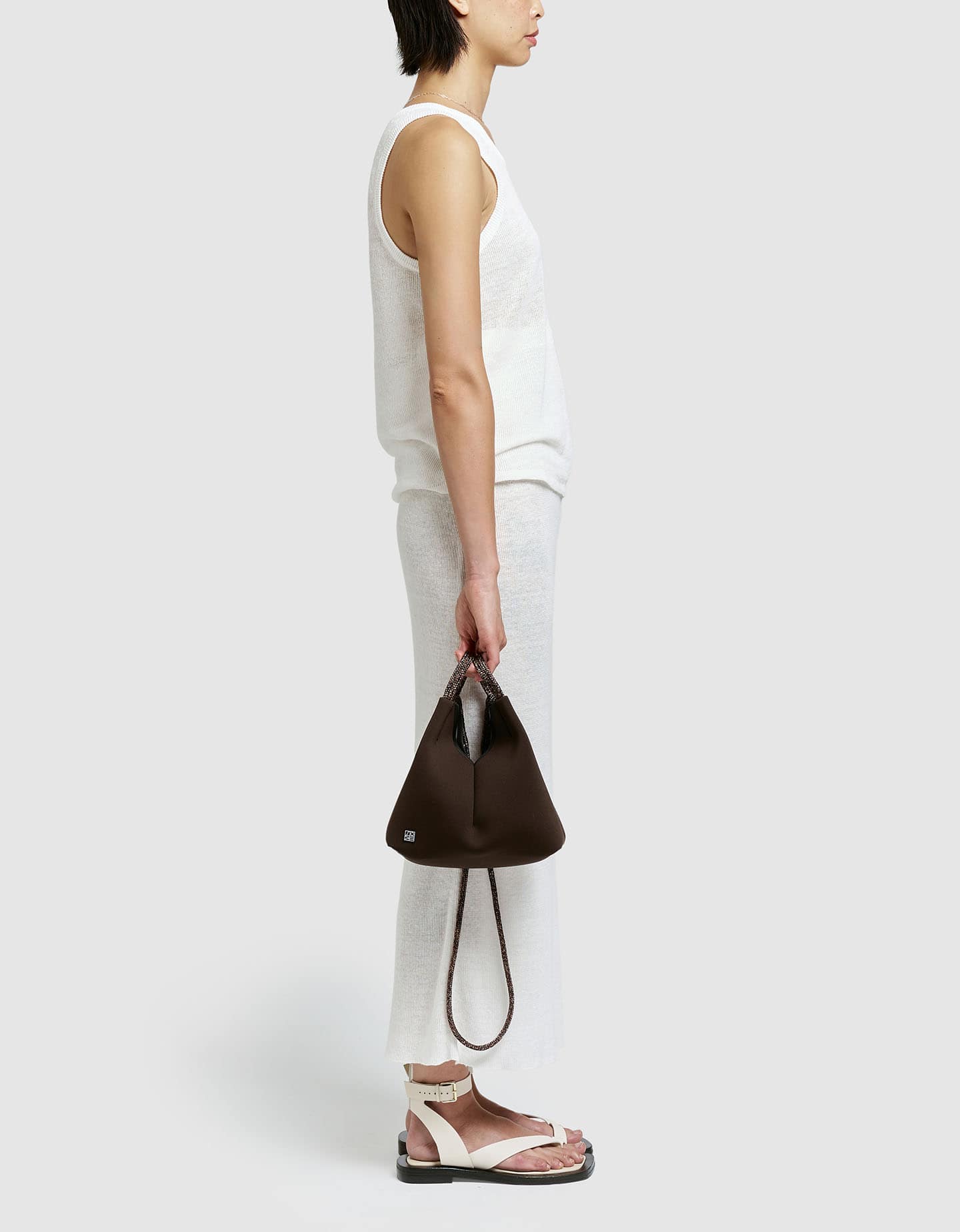 クロスボディスタイルで身軽に、必要最低限なものだけを持ち歩くミニマルスタイルで心も体も開放され、周囲の景色を存分に楽しめます。また、長いロープをサイドに垂らし、トップハンドルで手持ちすることで、洗練された魅力的な印象を演出できます。