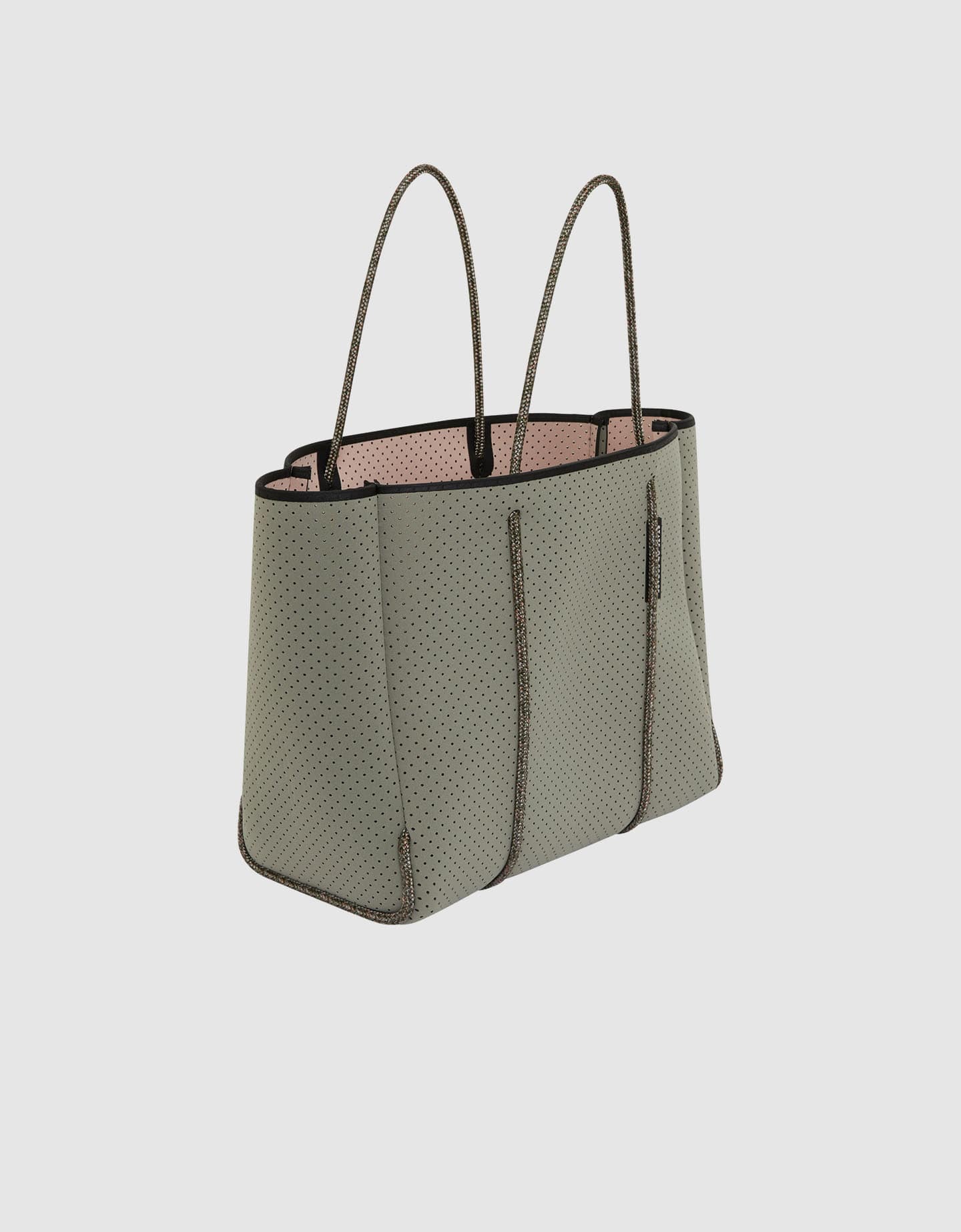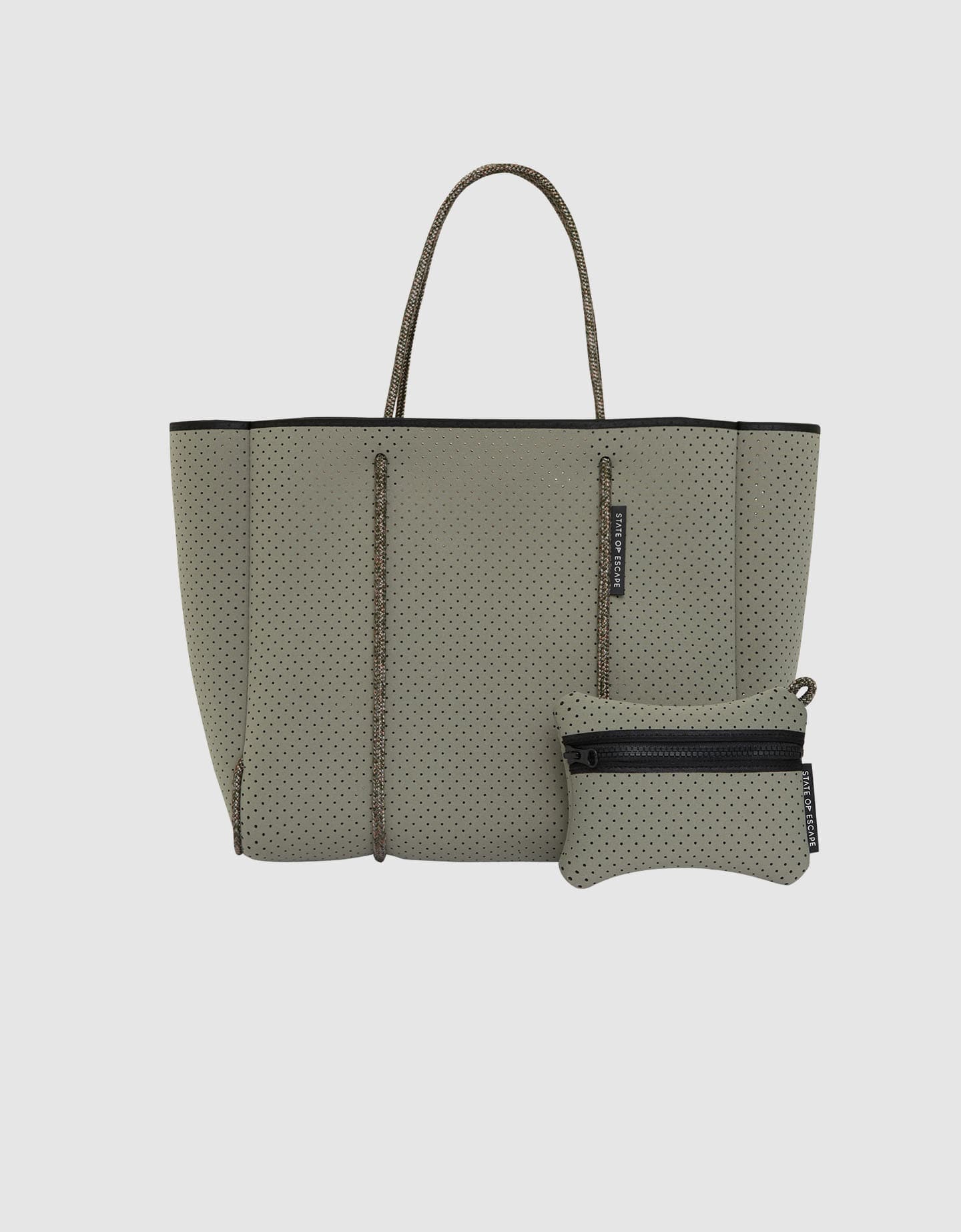 バッグ底部のカラビナに装着できる同素材のポーチが付いており、小物の収納に最適。肩にかけるだけでなく、ハンドバッグとしてもエレガントに、オンオフ問わず幅広いシーンで活躍するバッグです。