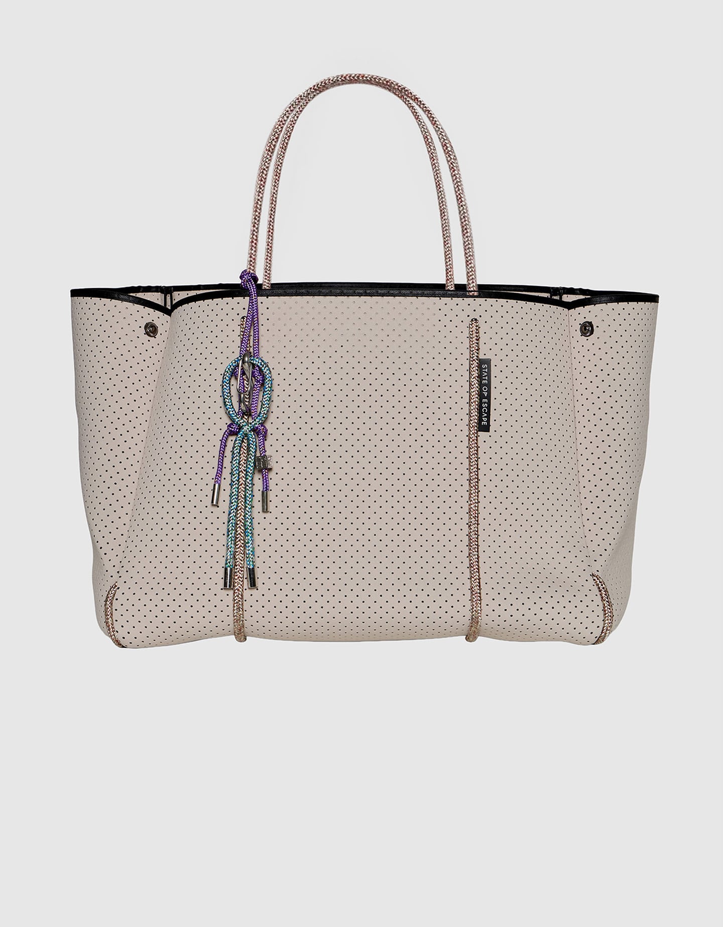 ミニミー バッグチャームは、バッグの持ち手にフックやループで取り付けることができ、重ね付けも楽しめるSTATE OF ESCAPEの新たな相棒。環境に配慮されたアップサイクルのセーリングロープから丁寧に製作されています。ネーミングは、STATE OF ESCAPEと共に歩んできた女性達にちなんで名付けられており、「オリビア ミニミー バッグチャーム」は、中心の大きなループが特徴的なデザイン。