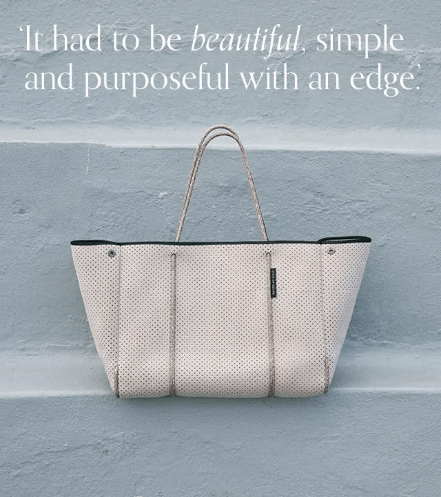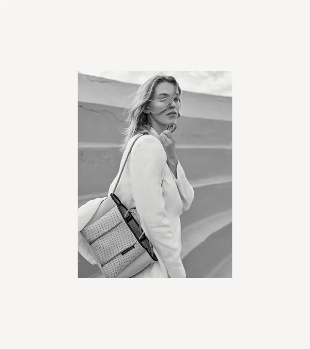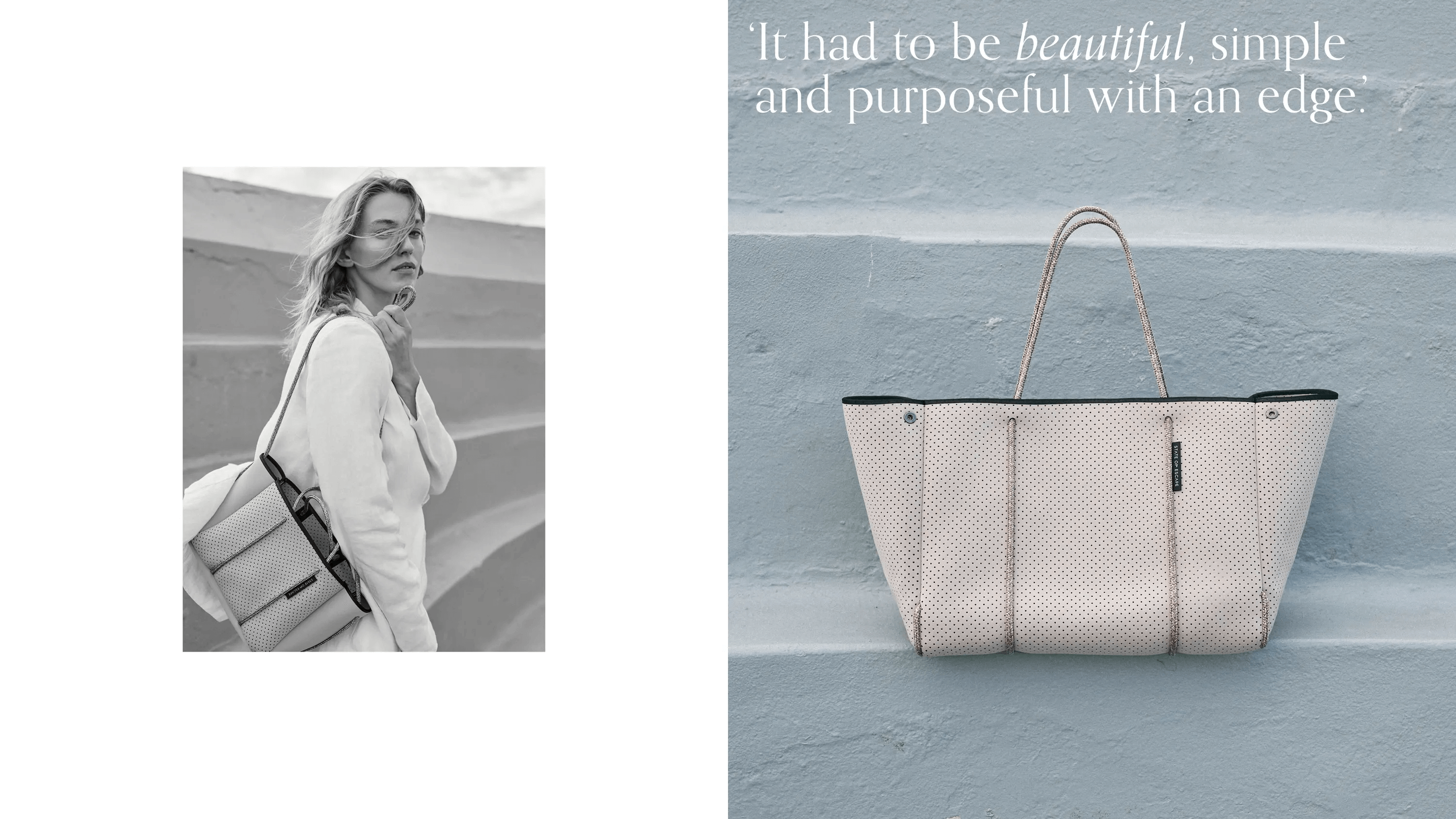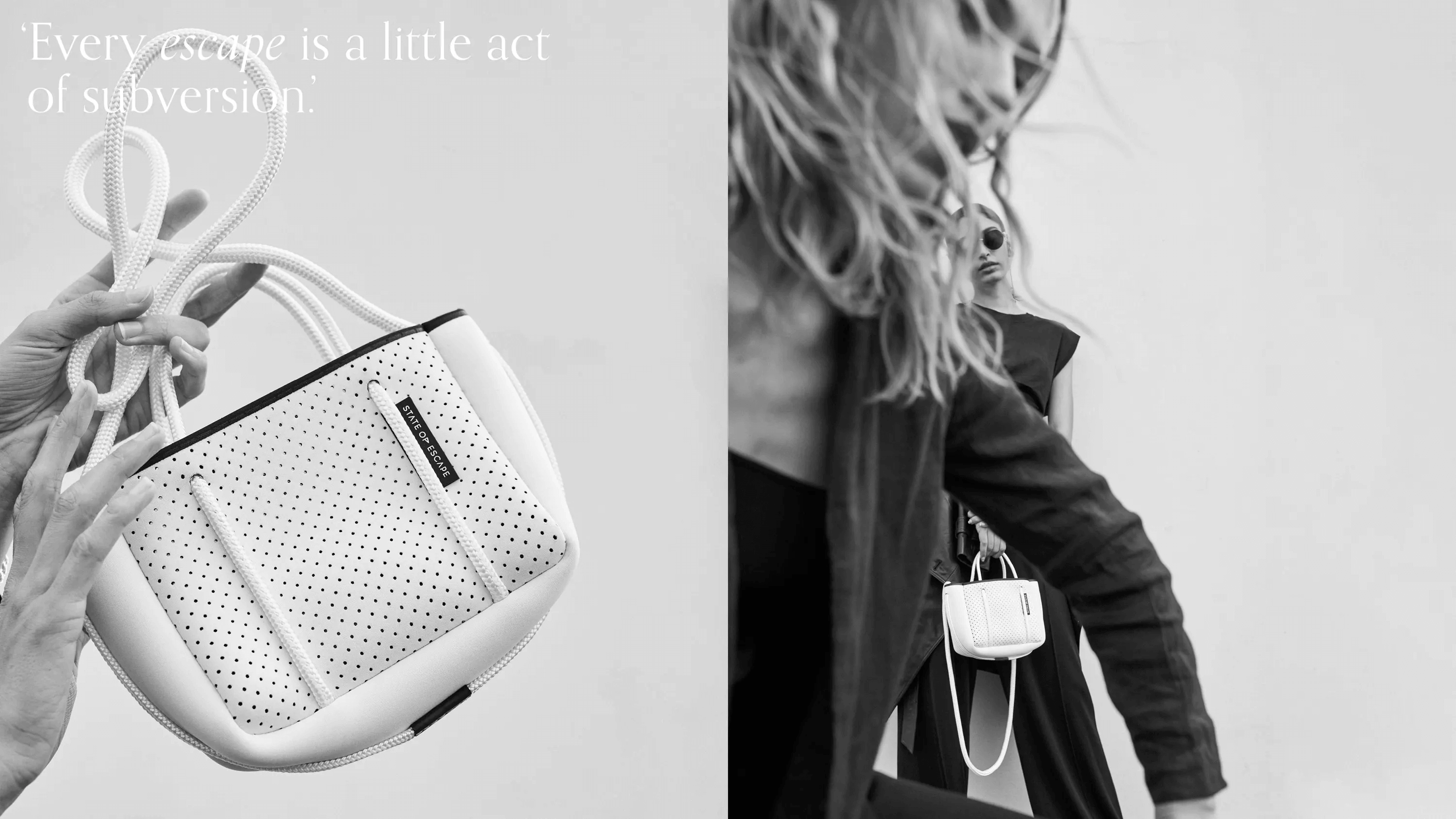 ブリジットとデズリーは、強い目的意識を持って行動することで、自然とクラシックなデザインにオリジナリティをプラスしたものを求めるようになりました。ネオプレン特有の海洋的で自由なイメージが、持つ人を解放し、輝かせるものに変わっていく。オリジナルのEscapeコレクションが誕生しました。