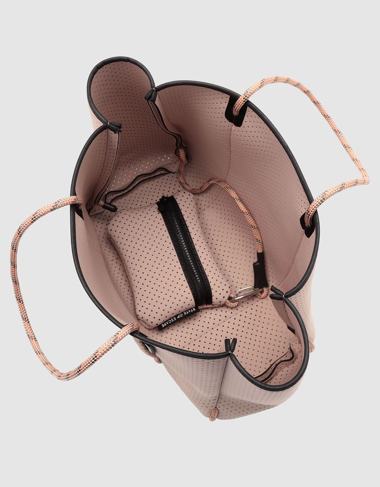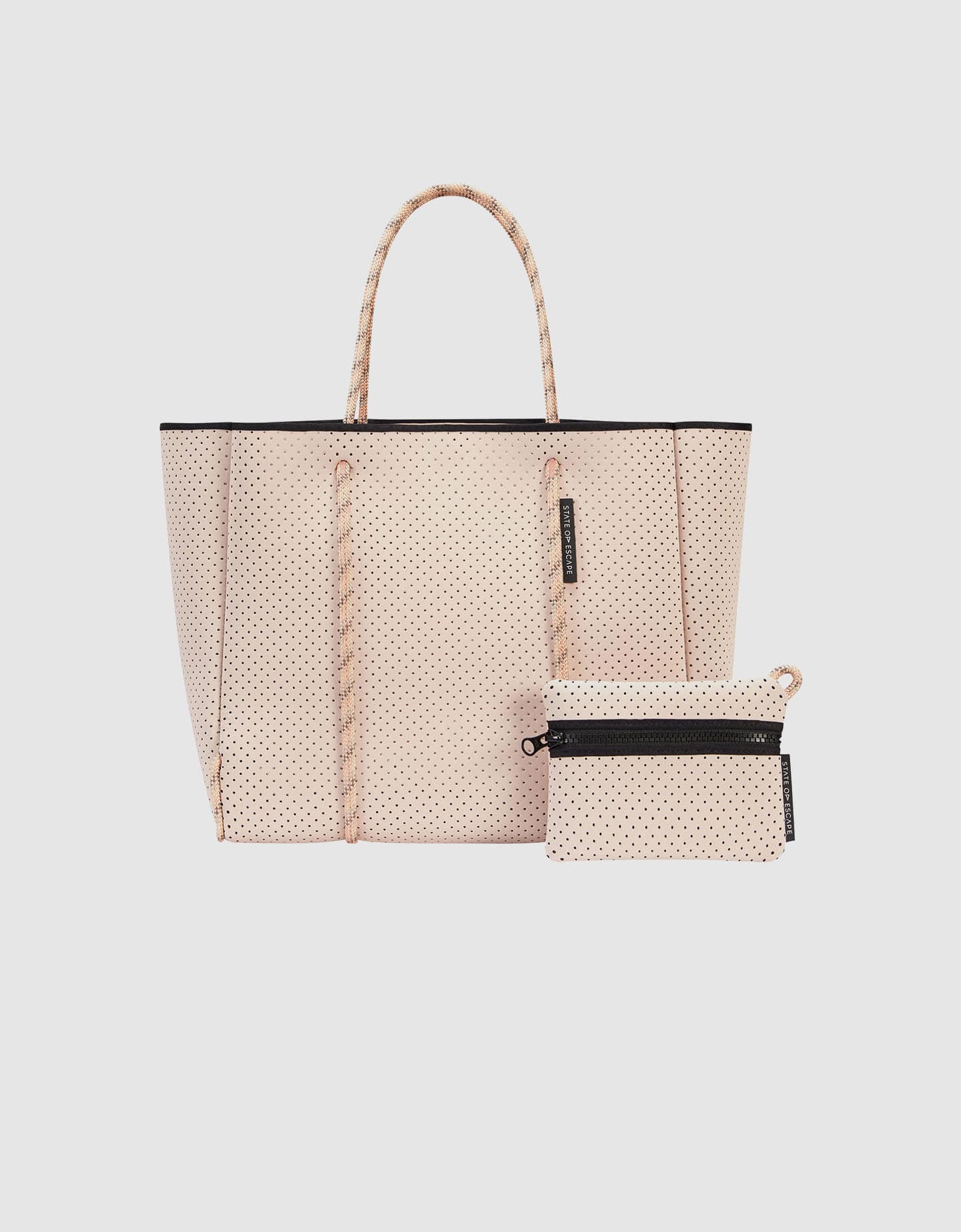 バッグ底部のカラビナに装着できる同素材のポーチが付いており、小物の収納に最適。肩にかけるだけでなく、ハンドバッグとしてもエレガントに、オンオフ問わず幅広いシーンで活躍するバッグです。