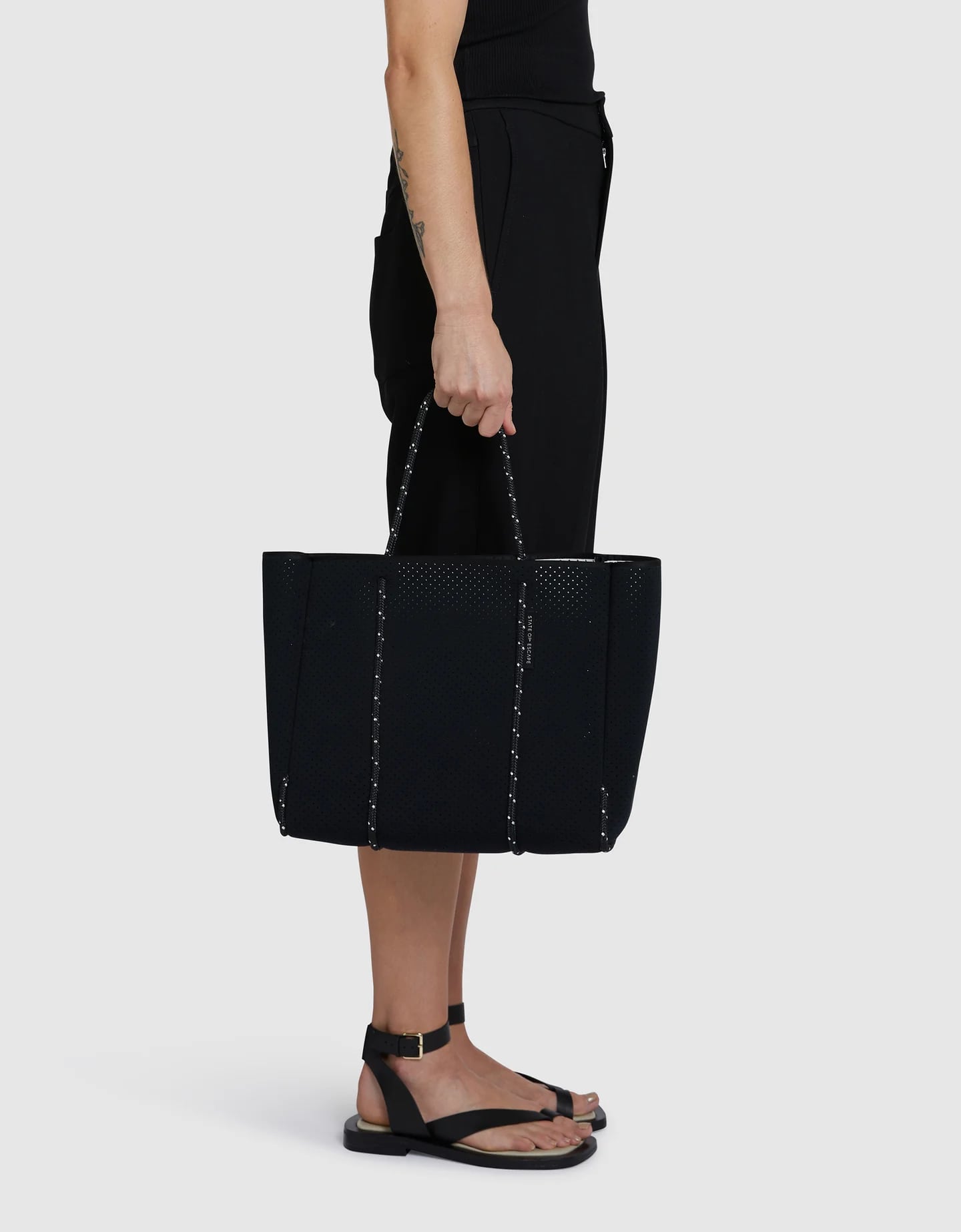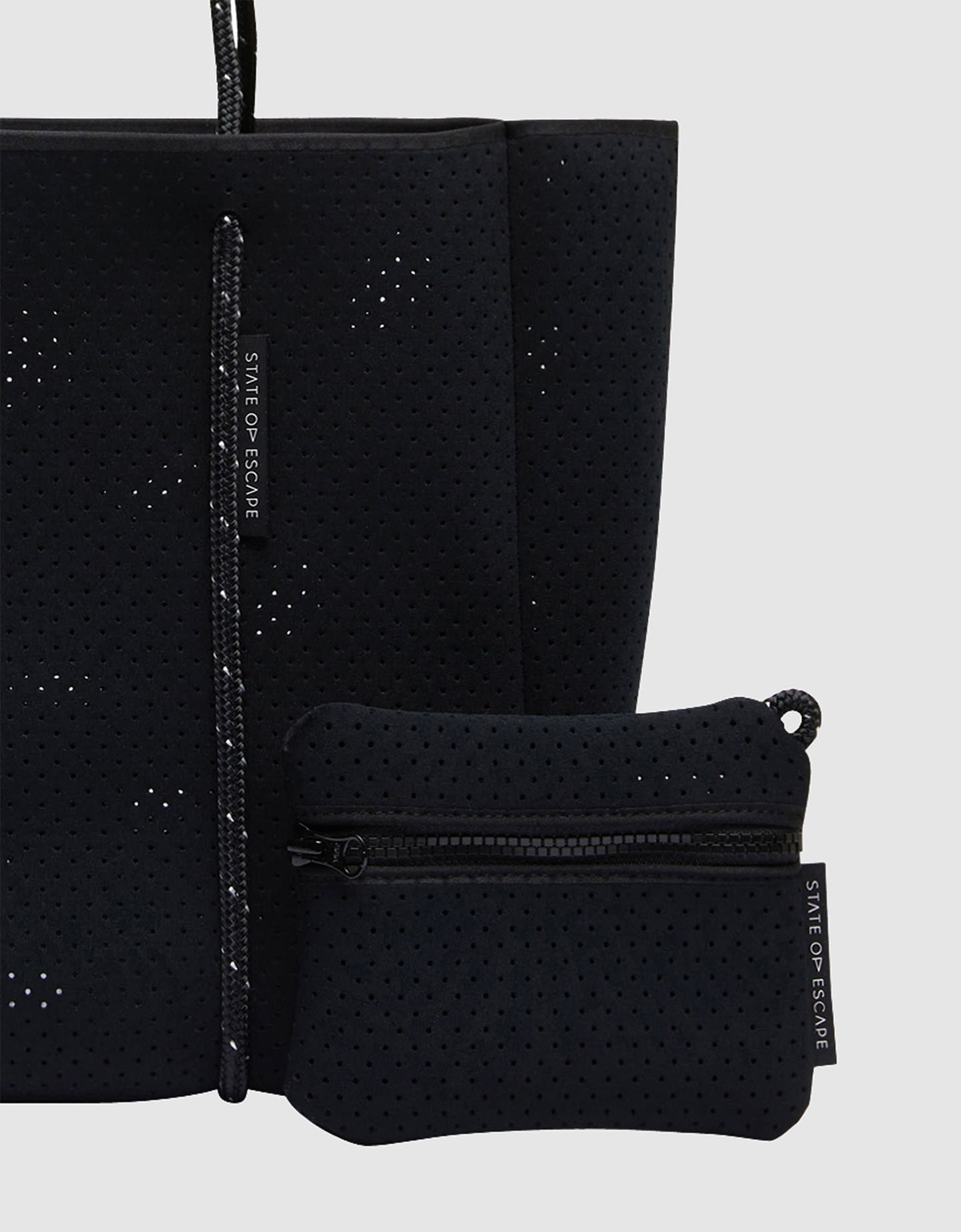 バッグ底部のカラビナに装着できる同素材のポーチが付いており、小物の収納に最適。肩にかけるだけでなく、ハンドバッグとしてもエレガントに、オンオフ問わず幅広いシーンで活躍するバッグです。