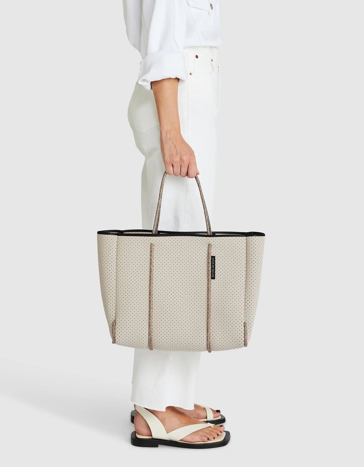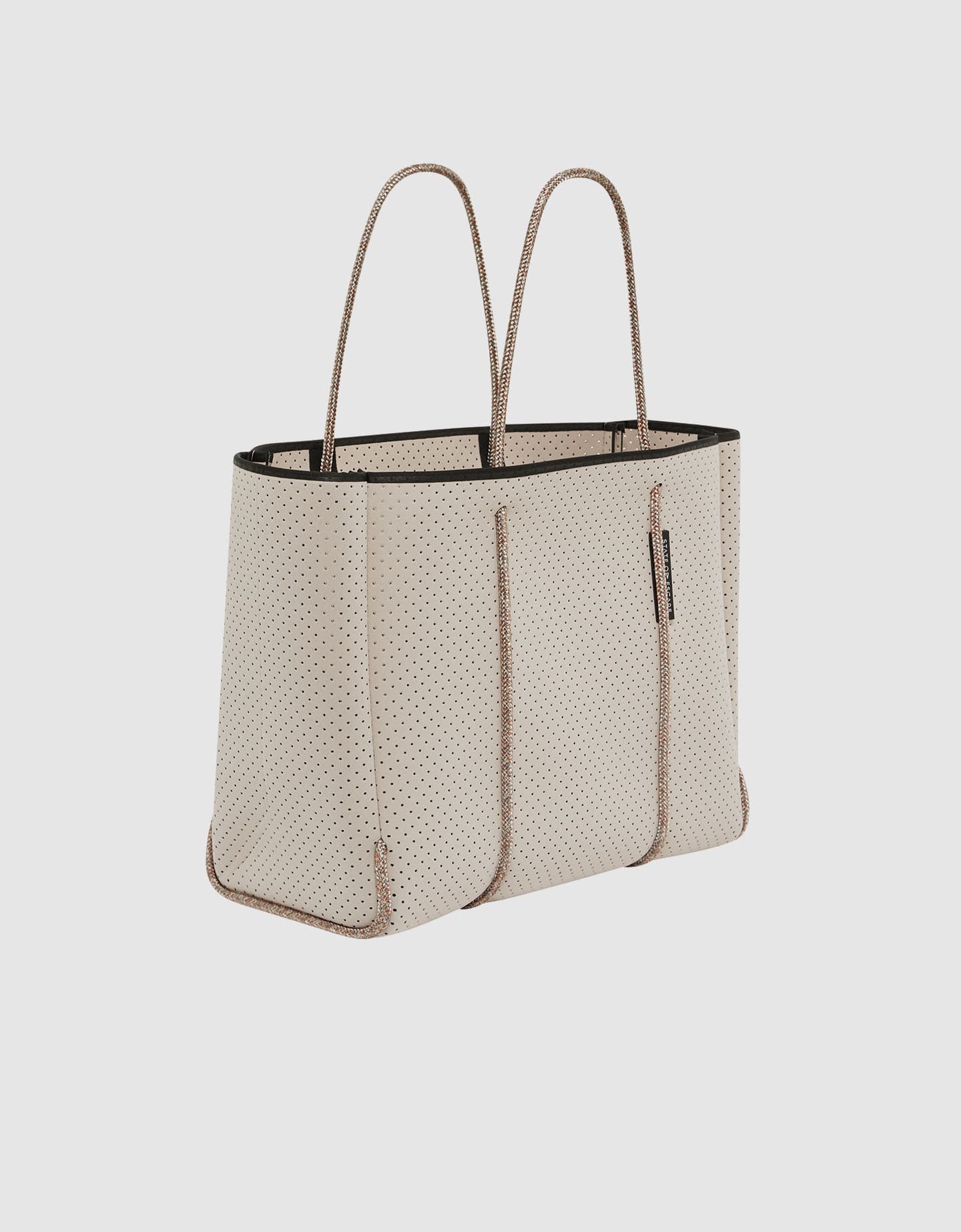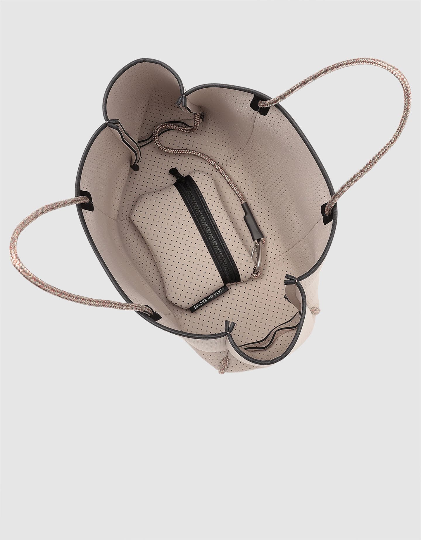 バッグ底部のカラビナに装着できる同素材のポーチが付いており、小物の収納に最適。肩にかけるだけでなく、ハンドバッグとしてもエレガントに、オンオフ問わず幅広いシーンで活躍するバッグです。