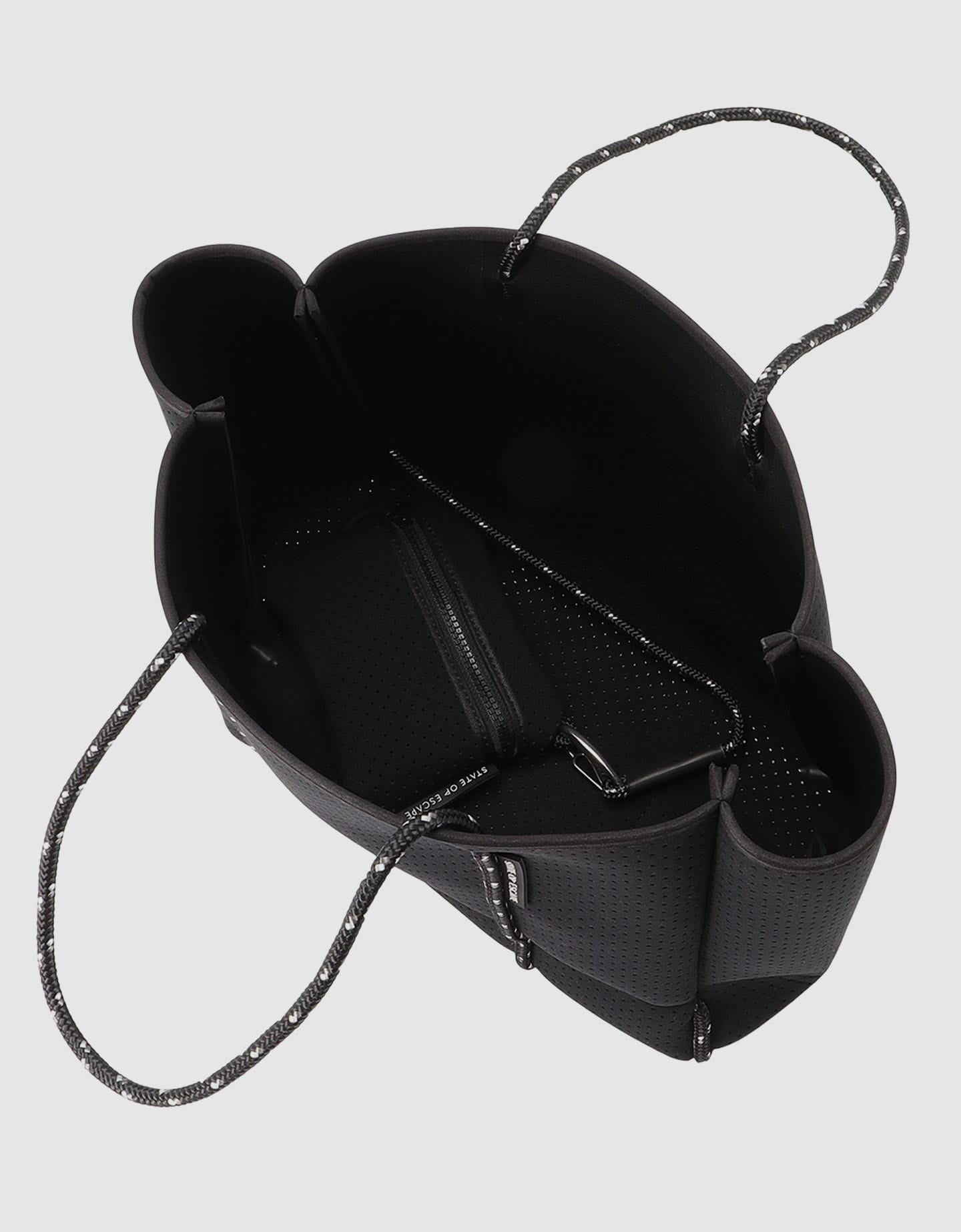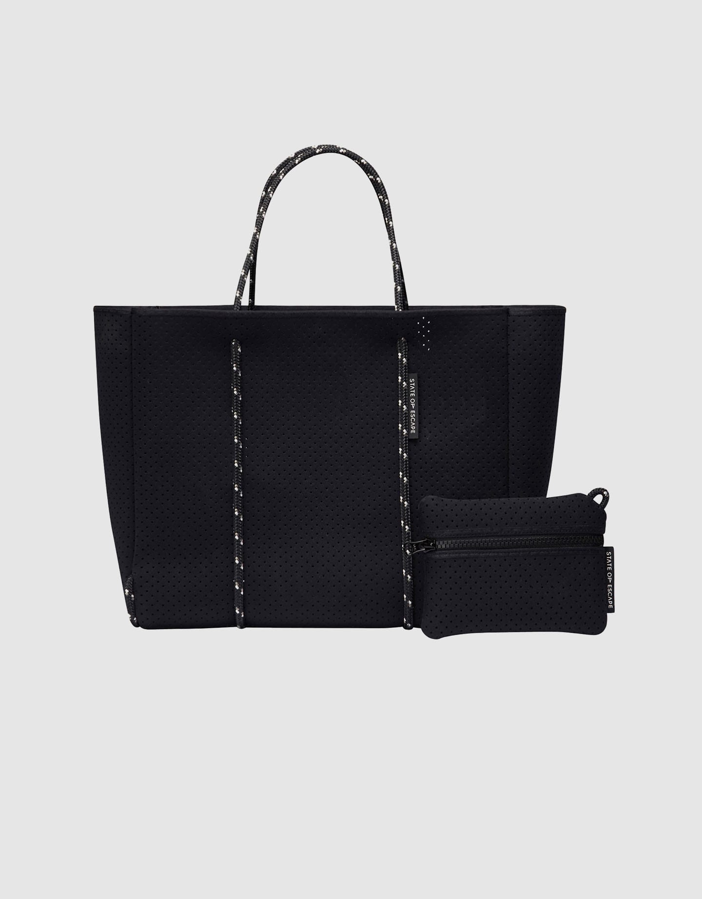 バッグ底部のカラビナに装着できる同素材のポーチが付いており、小物の収納に最適。肩にかけるだけでなく、ハンドバッグとしてもエレガントに、オンオフ問わず幅広いシーンで活躍するバッグです。