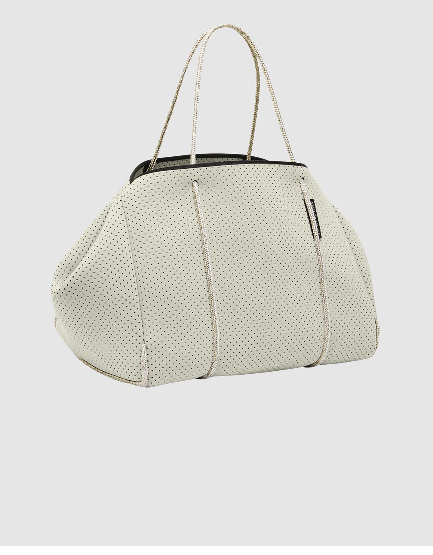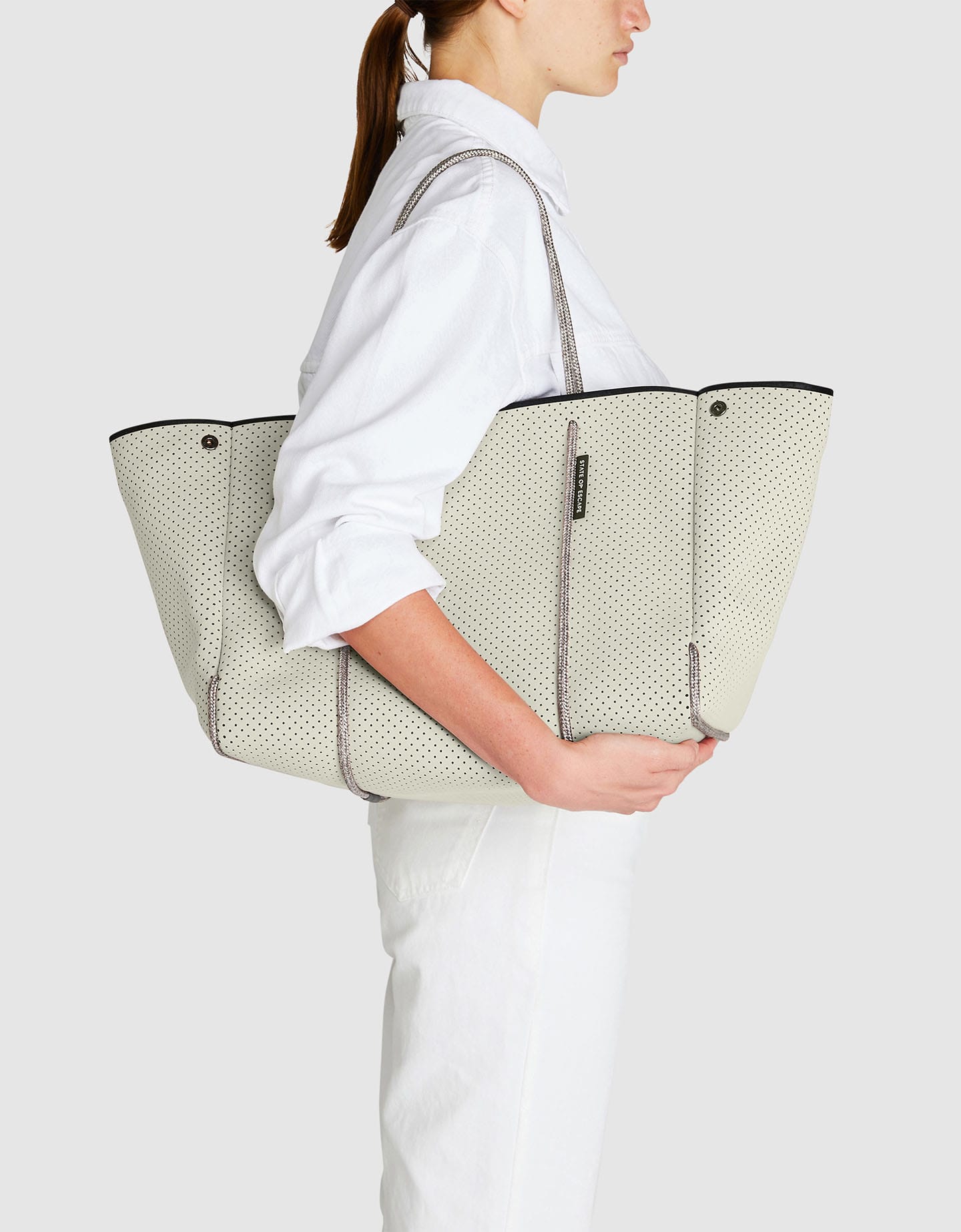 トレンドに左右されないエレガントな佇まいの、ブランドのシグネチャーモデル「エスケープ」から全てが始まりました。パンチングされたネオプレン生地に、ボディを引き立てる美しいセーリング用のロープを使用することで、シンプルながらも完成度のあるルックスを実現。同素材のポーチが付いたこの美しくてたっぷり入るバッグは、旅行に行く時にも毎日のお出かけにもぴったりです。とことんシンプルなのに注目されてしまう、心も身体も軽くなるバッグです。